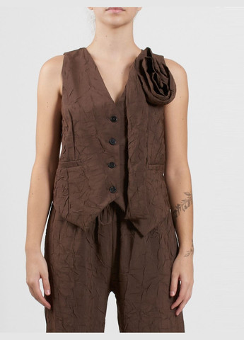 Жіночий жилет Tensione In — це стильна та унікальна річ із гофрованою текстурою та насичено-коричневим кольором. Він має спереду на ґудзиках, структурований крій і асиметричну квіткову деталь на плечі, що додає нотку елегантності. Жилет без рукавів із V-подібним вирізом, що робить його ідеальним для надягання поверх блузи або як яскравого одягу.