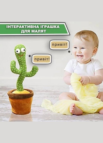 Танцюючий кактус – нова музична говоряча іграшка для вашої дитини – хіт Тік-Тока 2021р. Іграшка являє собою ляльку, що вміє ворушитися, співати, розмовляти, у формі кактуса в горщику з великими очима і усміхненим обличчям. Іграшка танцюючий і співаючий кактус дуже весело танцює, світиться і відтворює 120 мелодій. Так само вона здатна запам'ятовувати ваші слова і повторювати їх, забавно танцюючи при цьому. Плюшевий танцюючий кактус – це найкращий подарунок, який надовго захопить як дітей, так і дорослих, і подарує купу радісних емоцій.Особливості іграшки:•Інтерактивна гра для Вашого малюка – іграшка хороша для дошкільного виховання, оскільки кактус танцює в ритмі, привертаючи увагу дітей і залучаючи їх до гри;•Завдяки LED підсвічуванню кактус може бути чудовою іграшкою-нічником для Вашого малюка перед сном;•Різноманітність функцій забезпечить тривалий інтерес малюків до неї;•Може бути відмінним подарунком не тільки дітям, а й дорослим, оскільки весела музика і танці дуже підходять для створення приємної атмосфери на робочому місці;)•Відмінний дизайн іграшки добре вписується в інтер'єр як декоративний елемент;•Іграшка виконана з високоякісних матеріалів.Характеристики:•Матеріал: плюш;•Розмір іграшки: 32 см;•Функціонал: виконує 120 пісень, світиться, танцює, повторює слова;•Джерело живлення: 3 батарейки типу AA (в комплект не входять);•Вага: 210 г.