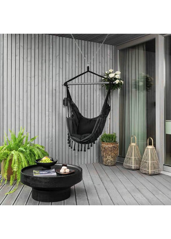Підвісне крісло - це надзвичайно функціональна розвага для дітей і дорослих, чудове місце для відпочинку, а також прикраса для будь-якого інтер'єру. Ідеально підходить для балкона, саду або навіть дитячої кімнати чи вітальні. Гойдалки дуже універсальні - їх можна прикріпити до гілки дерева в саду, балки в садовій альтанці, або до стелі на балконі чи будинку. Особливості: - Суцільне плетіння - Подвійні плетені канати для складання - Два способи кріплення (на один гачок або на два окремих) Характеристики: - максимальне навантаження: 150 кг - матеріал ниток: 65% поліестер, 35% бавовна - колір: чорний - тип гамака: одномісний