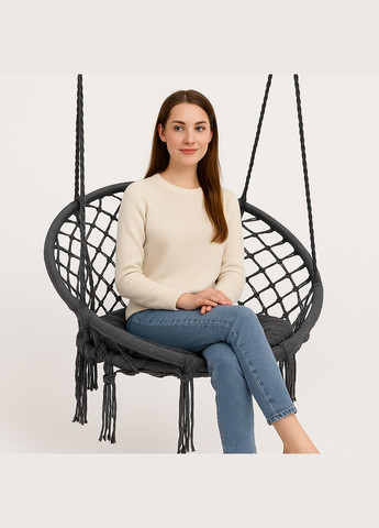 Підвісне крісло-гойдалка WCG 80 см + м'яка подушка | Плетене кругле крісло в стилі бохо Пориньте в атмосферу затишку та розслаблення з підвісним кріслом-гойдалкою WCG - ідеальний вибір для дому, балкона, дачі, тераси або лаунж-зони. М'яка подушка, приємна тканина, декоративна бахрома та стильний дизайн створюють особливий настрій, який хочеться дарувати собі знову та знову. Качеля представлена в 4 актуальних кольорах: чорний, білий, графітовий і коричневий. Кожен колір – це універсальне рішення для інтер'єру чи саду, де важливі не лише комфорт, а й естетика. У комплект входить м'яка подушка в тон крісла, що забезпечує додаткову зручність та гармонійний зовнішній вигляд. Підвісне крісло-гойдалка Boho WCG | Крісло-гамак для кімнати Стильне крісло-гамак у стилі бохо додасть затишку вашій спальні, балкону чи лаунж-зоні. Міцне плетіння, м'яка подушка та зручна форма – ідеальне місце для відпочинку та релаксу. Переваги нашої круглої підвісної гойдалки: Надійні матеріали: 65% бавовна + 35% поліестер - приємна на дотик, зносостійка тканина Посилений каркас: оцинкована сталь діаметр 22 мм - витримує до 150 кг навантаження Глибоке сидіння: діаметр 60 см, діаметр 60 см М'яка подушка: товщина 10 см, діаметр 60 см, наповнювач добре тримає форму. см Загальна висота: 120 см Діаметр плетених ниток: 3 мм Кількість тросів: 4 шт по 80 см Максимальне навантаження: 150 кг Вага крісла: 2,8 кг Гарантія: 12 міс Чому варто купити підвісне крісло вже сьогодні: Це не просто гойдалка - це ваш особистий простір різних зонах Ідея подарунка з настроєм: підійде жінці, подрузі, дитині або навіть бабусі. Це стиль життя, де затишок та комфорт стають пріоритетом.