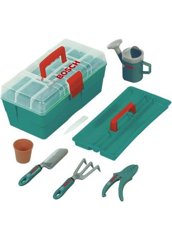 Ящик садових інструментів Bosch (Бош) Gardening Box — набір мініатюр справжніх садових інструментів для вирощування рослин вдома. Садівництво — довгий і копіткий процес, який через деякий час може порадувати своїми плодами — кольором, новими листочками, зав'яззю. А спробувати себе у благородній справі можна ще з дитинства за допомогою скриньки для юного садівника чи юної садівниці. Основні переваги: набрати земельки, підрізати гілочки або полити рослину стануть важливими діями гри, а заразом це дасть розуміння процесу вирощування, допоможе розібратися з етапами догляду за рослиною та її розвитком всі елементи поміщаються в зручний кейс, який має зручну застібку валізу легко переносити, до того ж вона займає мінімум місця на полиці для іграшок всі елементи виготовлені з безпечного і досить міцного пластику Характеристики Комплектація: садовий ящик, горщик, сівалки, лопата, граблі, садові ножиці та інструкція з вирощування рослин Виробник: Bosch, Німеччина. Рекомендовано для дітей віком від 3 років.