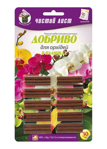 Вирощування орхідей - це ціле мистецтво, що потребує належної уваги на кожному етапі цього процесу: від правильного вибору субстрату до регулярних та збалансованих підживлень. У природі ці рослини отримують поживні речовини з кори дерев, опадів та повітря, тому звичайні добрива їм не підходять. На допомогу в таких випадках завжди приходять спеціально розроблені комплекси всіх необхідних домішок та вітамінів, аби стимулювати довгострокове та рясне цвітіння. Добриво в паличках для орхідей від ТМ «Чистий Лист» – це ідеальне рішення для ваших рослин, що забезпечує оптимальне живлення протягом 3 місяців. Воно розроблене спеціально для орхідей, а тому не перенасичує їх солями та хімікатами, а м’яко та рівномірно живить корені та сприяє утворенню нових бутонів та суцвіть. Основні властивості: Підтримує делікатну кореневу систему та надає оптимальне живлення без ризику перенасичення. Допомагає утворенню нових квітконосів та продовжує життя вже наявних суцвіть. Одна паличка поступово віддає поживні речовини протягом 3 місяців. Завдяки ідеальному балансу макро- та мікроелементів допомагає рослині рости міцною, здоровою та стійкою до стресів. Максимальна зручність у використання - не вимагає інших допоміжних дій чи препаратів. СПОСІБ ЗАСТОСУВАННЯ: 1. Перед використанням обов'язково треба перевірити вологість грунту: якщо він сухий - полляти відстояною водою кімнатної температури. 2. Виміряйте діаметр горщика. 3. Визначте необхідну кількість паличок за цими вказівками: Менше 5 см – 0,5 шт. 5-10 см – 1 шт. 10-15 см – 2 шт. 15-20 см – 3 шт. 20-25 см – 4 шт. 25-30 см – 5 шт. 30-35 см – 6 шт. Більше 35 см – на кожні додаткові 5 см + 1 паличка. 4. Занурте палички в ґрунт на глибину 2 см біля стінки вазона. 5. Повторно полийте рослину. 6. Вимийте руки та обличчя з милом.