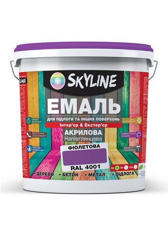Універсальна акрил-поліуретанова емаль SkyLine (Скайлайн) для підлоги та інших поверхонь має найвищу ступінь зносостійкості, що дозволяє виконувати високоякісне покриття для захисту та декоративного оздоблення різних типів поверхонь всередині та зовні приміщень. Головна особливість емалі полягає у можливості використання її для фарбування підлоги. На відміну від фарб на основі органічних розчинників не має запаху, не виділяє токсичних речовин і є екологічно чистою, що дозволяє проводити оздоблювальні роботи з максимальним комфортом. ПРИЗНАЧЕННЯ: Для декоративно-захисного фарбування різних поверхонь, таких як: метал, дерево, пластик, цегла, бетон, пінополістирол, ДСП, ДВП, скло, підлога. Може бути використана на вже пофарбованих раніше поверхнях як водно-дисперсійними фарбами, так і фарбами на основі органічних розчинників. Найкращий варіант для фарбування різних типів підлог. ПІДГОТОВКА ПОВЕРХНІ І СПОСІБ ЗАСТОСУВАННЯ: Нова поверхня. Поверхня має бути чистою, сухою та міцною. На відшпакльовані поверхні емаль слід наносити не раніше, ніж через 5 діб. Високопоглинаючі поверхні (бетон, газобетон, гіпс тощо) слід попередньо обробляти грунтовкою глибокого проникнення TM «SKYLINE». Металеві поверхні мають бути попередньо загрунтованими грунтовкою ПФ або ГФ. Нова, раніше не фарбована дерев'яна або бетонна підлога, повинна фарбуватися в 2 шари. Нова бетонна підлога фарбується не раніше, ніж через 28 діб. Раніше пофарбована поверхня. Поверхня має бути чистою, сухою та міцною. Металеві поверхні, покриті іржею, необхідно очистити від крихкої іржі та прогрунтувати антикорозійною грунтовкою. НАНЕСЕННЯ: Перед використанням необхідно ретельно перемішати, при необхідності додати не більше ніж 10% води. Можна наносити пензлем, валиком або фарборозпилювачем. При роботі з фарборозпилювачем рекомендований діаметр сопла від 1.4 мм до 1.8 мм. Інструменти промити водою одразу після закінчення робіт. ТЕХНІЧНІ ХАРАКТЕРИСТИКИ: Час висихання одного шару – 3-6 годин; Повне затвердіння – 24 години; Стійкість до механічних впливів – через 48 годин; Витрати – 80-120 мл/м2; (в один шар, залежно від способу нанесення); СКЛАД: Полімерне зв’язуюче, пігменти, функціональні добавки, вода. Всі рекомендації ефективні при температурі повітря 18-22 °С. та за відносної вологості повітря 65%. В інших умовах час висихання може змінитись. Температура застосування – не нижче +5°С; Зберігання за температури від +5° до +35°С. У щільно закритій тарі, уникаючи прямого потрапляння сонячних променів. Гарантійний термін зберігання – 24 місяці в оригінальній упаковці виробника за умови дотримання правил зберігання. *Колір продукції являється наближеним до каталогу RAL Для виключення відмінностей у відтінках кольору, при фарбуванні поверхонь рекомендується використовувати продукцію однієї партії. У випадку використання продукції різних партій необхідно проводити їх змішування. Для отримання насичених кольорів емалі для підлоги (жовтий, червоний, рожевий, помаранчевий, зелений, салатовий або блакитний), поверхня, що фарбується має бути однотонною. В іншому випадку може виникнути необхідність в нанесенні додаткових шарів. Для зменшення витрат колерованої (в насичений колір) емалі, поверхню необхідно попередньо пофарбувати базою А (Білою або колерованою в схожий пастельний відтінок). Виробни