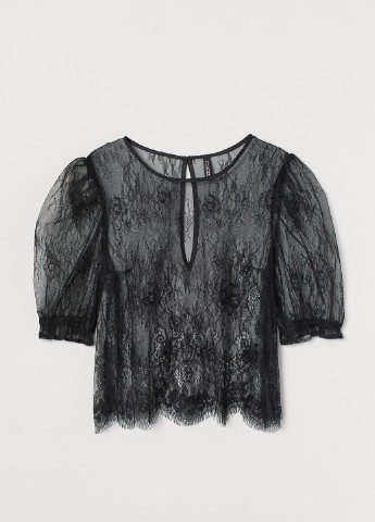 Приталена блузка з мережива, що просвічує. На блузці короткі рукави із декоративними оборками. Виріз на гудзику ззаду біля горловини. Необроблений край знизу на рукавах і внизу блузки. У виробі можливе пошкодження бірки.