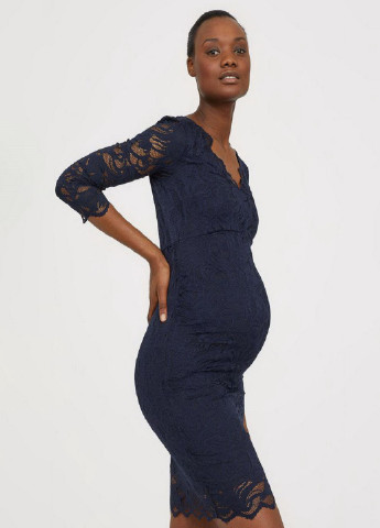 Коротка мереживна сукня з V-подібним вирізом, вирізом і гудзиком ззаду на шиї та рукавами довжиною 3/4. Складання в бічних швах для кращої посадки на животі. Підкладка трикотажна. На розмір М: довжина - 93 см. Можливе пошкодження бірки. У виробі можливе пошкодження бірки.