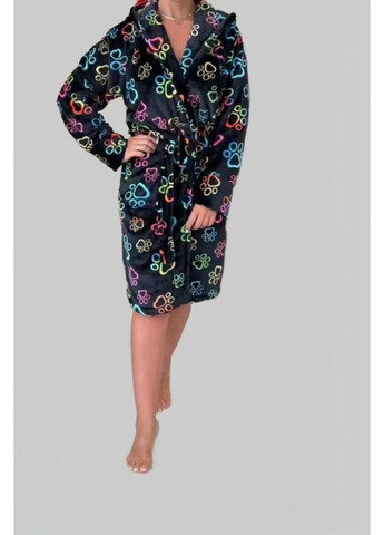 Розміри не маломірні Жіночий халат ПРИНТ різноколірні лапки тканина полірована махра Подвійний капюшон, подвійний підборт , подвійний рукав на запах із поясом.Зручний капюшон та дві практичні кишені.Довжина до колін забезпечує легкість рухів та затишок.Добре зберігає тепло, не дратує шкіру.Ідеально підходить для використання в домі та в бані. Довжина 110 см