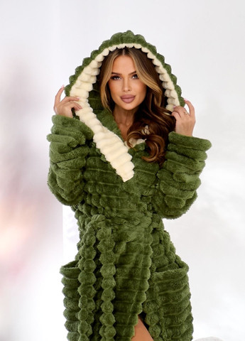 Халат жіночий, теплий. Мʼякий та приємний до тіла, виготовлений з тканини софт (синтетична м'яка ворсиста тканина). Склад: 60% бавовна, 40% поліестер. Щільність: 300 г/м2 Прямого крою, на запах. Передбачений обʼємний капюшон та кишені. Зручна посадка забезпечує комфорт та зручність для щоденного використання, а також для використання після банних процедур.