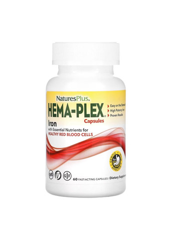 Властивості продукту: Підтримує нормальне кровотворення Допомагає підтримувати нормальний рівень гемоглобіну поганому згортанні крові Підтримує високий рівень енергії та життєвого тонусу Підтримує імунну систему Допомагає зміцненню судин Підтримує нормальне згортання крові Показання до застосування Як харчову добавку приймати по одній таблетці на день або за призначенням кваліфікованого лікаря. Що це? Комплекс Hema-Plex від Nature's Plus забезпечує потужну живильну підтримку загального здоров'я крові з високоефективним хелатним залізом: 85 мг на одну таблетку. Використовується спосіб повільного вивільнення для кращого засвоєння. Як це працює? До формули цього комплексу входять такі важливі для здоров'я крові елементи, як залізо, вітаміни С та Е, вітаміни групи В, а також мідь та фолієва кислота. Залізо та вітамін В12 входять до складу гемоглобіну. Це білок, з якого складаються еритроцити. Залізо відповідає за захоплення кисню. Потім, за допомогою вітаміну В12 та міді кисень розходиться по кровотоку та поставляється у всі органи в людському тілі. Еритроцити також відповідають за збирання вуглекислого газу та переміщення його в легені для усунення з організму. Вітаміни групи В, а також вітаміни С та Е зміцнюють стінки судин, тим самим перешкоджаючи виникненню різного роду кровотеч. Цей унікальний синергічний комплекс поживних речовин забезпечує швидкий, ефективний та високоефективний перевірений результат. Елемент Вага Одиниця Відсоток Порція 1 таблетка Порцій в упаковці 30 Вітамін C (запатентований естерифікований комплекс у вигляді аскорбінової кислоти, аскорбіл пальмітату, аскорбату магнію, аскорбату калію, аскорбату цинку) 300 мг 333,00% Вітамін E (у вигляді d-альфа токоферилацетату) 20 (30) мг (МО) 133,00% Тіамін (вітамін B1) (у вигляді тіаміну гідрохлориду) 25 мг 2083,00% Рибофлавін (вітамін B2) 25 мг 1923,00% Ніацин (у вигляді нікотинаміду) 50 мг NE 313,00% Вітамін В6 (у вигляді піридоксину гідрохлориду) 25 мг 1471,00% Фолат (у вигляді кальцій-L-5-метилтетрагідрофолату) 667 (400) мкг DFE (мкг L-метилфолату) 167,00% Вітамін B12 (у вигляді метилкобаламіну) 500 мкг 20833,00% Пантотенова кислота (у вигляді пантотенату кальцію) 25 мг 500,00% Кальцій (у вигляді амінокислотного комплексу/хелату) 25 мг 2,00% Залізо (у вигляді амінокислотного комплексу/хелату) 85 мг 472,00% Цинк (у вигляді монометіоніну**) 5 мг 45,00% Селен (у вигляді амінокислотного комплексу) 10 мкг 18,00% Мідь (у вигляді амінокислотного хелату) 2 мг 222,00% Марганець (у вигляді амінокислотного комплексу/хелату) 5 мг 217,00% L-цистеїн (амінокислота у вільній формі) 50 мг † Proanthoplex Запатентований проантоціанідин/біофлавоноїд Комплекс: Біофлавоноїди (з плодів та шкірки цитрусових), плоди червоної малини, плоди чорної малини, листя зеленого чаю, плоди чорниці 25 мг † Буряк (Beta vulgaris) 15 мг † Bioperine *** (екстракт плодів чорного перцю) (2,37 мг піперину) 2,5 мг † † Добова норма не визначена. ** OptiZinc® *** BioPerine®