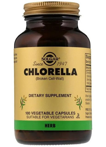 Хлорелла (Chlorella - це зелена суперїжа (з водоростей) з найбільшим вмістом хлорофілу, бета-каротину, вітаміну С та заліза. Натуральний препарат для детоксикації організму). Виробник: Solgar, США Форма випуску: 100 капсул Вік: 18+ Склад: Компонент Склад 1 капсули Хлорелла (порошок із подрібнених водоростей) 520 мг Інші інгредієнти: Овочева целюлоза, мікрокристалічна целюлоза, стеарат рослинного магнію. Не містить: Клейковина, пшениця, молочні продукти, соя, дріжджі, цукор, натрій, штучний ароматизатор, підсолоджувач, консерванти та колір. Функціональна дія: Хлорелла містить велику кількість хлорофілу (в 3 рази більше, ніж спіруліну), структура якого майже ідентична структурі гемоглобіну. За рахунок цього хлорел стимулює процес кровотворення. Стимулює імунну систему та вироблення інтерферону – білка, який має антивірусну активність. Є сильним антиоксидантом. Має лужну дію на організм. Є джерелом рослинного білка, якого у хлореллі близько 55%, що значно більше, ніж у м'ясі (близько 22%). Крім того, цей білок містить абсолютно всі незамінні амінокислоти! Містить майже всі мікроелементи, але у найбільшій кількості залізо. Є детоксикантом. Очищує організм. Виводить важкі метали та отруйні речовини з організму. Сприяє швидкому загоєнню ран та відновленню тканин. До того ж досліджуються і протиракові властивості хлорели, у яких переконані деякі вчені. Покращує роботу кишечника, очищає його, нормалізує перистальтику, стимулює ріст нормальної мікрофлори. Має антисептичний ефект. Санує порожнину рота та ШКТ. Бореться з гіпертонією та діабетом. Застосування: Як харчову добавку дорослим приймати по одній (1) вегетаріанській капсулі до трьох разів на день, бажано під час їжі або відповідно до вказівок лікаря.