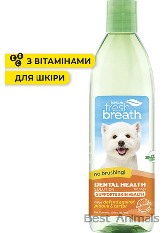 Щоденна гігієна порожнини рота. Сприяє оздоровленню ясен, усунення неприємного запаху з рота, а також сприяє оздоровленню травної системи. Щоденна гігієна порожнини рота відіграє важливу роль для здоров'я домашніх тварин. Без належної стоматологічної допомоги, 70% собак і котів у віці від 3 років починають проявляти ознаки хвороб ротової порожнини, що може привести до втрати зуба або інших серйозних проблем. Добавка в воду Oral Care Water Additive Skin & Coat спеціально розроблена для щоденного використання з метою надання суттєвої щоденної гігієни порожнини рота. Засіб освіжає подих протягом 12 годин, усуває неприємний запах, профілактує утворення нальоту, зубного каменю і захворювань ясен, а також сприяє оздоровленню травної системи. Завдяки використанню природних джерел пребіотиків з кореня цикорію і модрини, наша добавка сприяє утворенню сприятливої мікрофлори, щоб підтримувати здоров'я домашніх тварин. Безпечна для домашніх тварин! Застосування : На 500 мл води додайте одну столову ложку (одна повна кришка флакона). Додавати кожен раз, коли Ви змінюєте воду, миска з водою завжди повинна бути чистою! Склад : очищена вода, лимонна кислота, хлорофілін, гліцерин, сорбат калію, омега-3 і омега-6 жирні кислоти, екстракт листя зеленого чаю. Фасування : 473 мл Виробник : Tropiclean, TropiClean Pet Products, США.