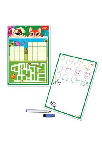 Малюємо, граємо та розважаємося разом із дошкою-тренажером! Набір містить двосторонню дошку та багаторазовий маркер. З кожної сторони зображені цікаві завдання та ігри. Дитина може пограти з другом у хрестики-нулики або самостійно пройти через лабіринт та помалювати. Можна зовсім не боятися помилок. Адже маркер легко витирається з поверхні дошки за допомогою спеціальної губки. До веселої гри можна повертатися безліч разів. Набір тренує фантазію, логічне мислення, пам’ять та дрібну моторику. Комплектація: двостороння дошка, маркер «Пиши-витирай».