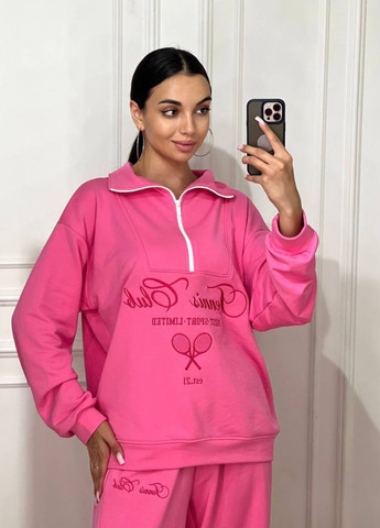 Жіночий спортивний костюм “Tennis Club” поєднує комфорт і стиль у кожній деталі. Кофта Polo на змійці прикрашена вишивкою з написом “Tennis Club” та декоративними тенісними ракетками, що надає виробу оригінального вигляду. Виконаний з високоякісної турецької трихнитки петля діагональ, костюм відзначається зносостійкістю та зручністю у носінні. Штани з еластичним поясом і шнурком для регулювання посадки, вільного крою для максимального комфорту. Заміри: Кофта – ОГ 124 см, довжина 70 см, довжина рукава від плеча 73 см Штани – довжина 105 см, талія 68-72 см (гумка + шнурок), стегна 130 см