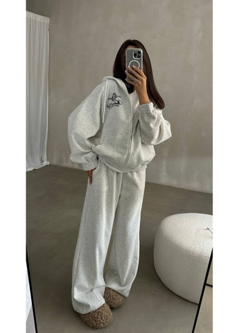 Жіночий спортивний костюм. Виготовлений з велюру на трикотажній основі, має нашивки зі стразами на худі та штанах. Костюм оверсайз крою та гарно сідає по фігурі. Костюм складається з худі та штанів прямого крою. Худі має спущену лінію плеча, капюшон з люверсами та шнурком, рукава на манжетах з гумкою. Знизу передбачений шнурок зі стопером-фіксатором, він допомагає затягуючи низ худі захищаючи від вітру. Штани мають дві бічні кишені з відрізним бочком, талія гумці зі шнурком.
