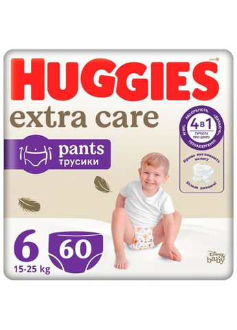 Підгузки-трусики Huggies Extra Care Pants 6 (15-25 кг), 60 шт. Huggies Extra Care Pants – це преміальні підгузки-трусики, створені для максимального комфорту та захисту ніжної шкіри малюка. Вони поєднують у собі м'якість, надійне вбирання та зручну посадку для активних дітей. Ультрам'які матеріали – ніжні до шкіри, не викликають подразнень Швидке вбирання – спеціальний внутрішній шар миттєво поглинає вологу Еластичний поясок 360° – забезпечує комфортну посадку без тиску Дихаючі матеріали – підтримують природну циркуляцію повітря Легке одягання та зняття – бокові шви легко розриваються для швидкої заміни Huggies Extra Care Pants 6 – ідеальний вибір для дітей вагою 15-25 кг, щоб кожен день був сухим, комфортним і безтурботним!