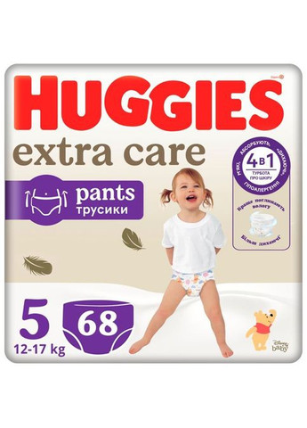 Підгузки-трусики Huggies Extra Care Pants 5 (12-17 кг), 68 шт. Huggies Extra Care Pants – це преміальні підгузки-трусики, розроблені для ніжної шкіри малюків. Вони забезпечують комфорт, захист від протікань і м'якість, необхідні для активного руху та здорового розвитку дитини. Ультрам'які матеріали – дбайливо огортають шкіру без подразнень Швидке вбирання – спеціальний шар миттєво поглинає вологу, зберігаючи сухість Еластичний поясок 360° – ідеальна посадка без натирання та тиску Дихаючі матеріали – сприяють природній циркуляції повітря для здорової шкіри Легкість у використанні – легко надягати, знімати та утилізувати завдяки боковим швам, що розриваються Ідеальний вибір для дітей вагою 12-17 кг, які потребують м'якого та надійного захисту кожного дня!