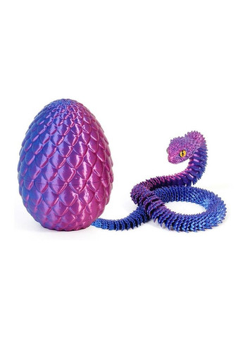 Іграшка ""Яйце зі змією"" – захоплюючий подарунок для дітей та дорослих. Ця яскрава синьо-фіолетова іграшка вразить усіх. Унікальний дизайн у формі яйця, яке приховує змію, перенесе вас у світ казкових створінь та фантазії. Іграшка має компактні розміри: висота яйця становить 8,5 см, а довжина змійки – 30 см. Вона складається з декількох функціональних елементів. Яйце легко розкручується, дозволяючи використовувати його не лише для гри, але й як зручний контейнер для зберігання дрібних іграшок, аксесуарів чи навіть улюблених солодощів. Особливістю цієї іграшки є змія, виготовлена із якісного пластику за допомогою сучасної технології 3D-друку. Завдяки спеціально розробленим шарнірним з'єднанням, кожен сегмент змійки рухається незалежно, створюючи ефект реалістичних рухів. Це дозволяє дитині взаємодіяти з іграшкою, розвивати моторику рук та уяву.