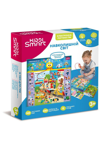 Електронна логічна гра KIDDI SMART – ВІКТОРИНА НАВКОЛИШНІЙ СВІТ – неймовірна та захоплива вікторина, яка допоможе дитині дізнатися багато цікавого про навколишній світ. Треба знайти та правильно поєднати логічні пари: звірят та їхні домівки, пори року та заняття, людей та професії, страв та їхні інгредієнти, та багато іншого! Малюку обов’язково сподобається поєднувати кольорові зображення та шукати правильні пари, адже при кожній правильній відповіді лампочка на голові робота буде світитися! А різне розташування відповідей на всіх картках спонукатиме дитину покладатися на свої знання. Нумо разом навчатися та гратися! У вікторині 12 тем для гри, що розвиває: Професії Домашня вечеря Велике місто Мій день Пори року Рослини Різнокольорова ферма Чия це тінь? Моя кімната Тіло людини Знайди пару Хто де живе Поринайте у веселу гру з ВІКТОРИНОЮ KIDDI SMART і вивчайте навколишній світ легко! У вікторині 280 запитання та відповіді та 140 логічних пар. Щоб розпочати гру, оберіть гральне поле та розташуйте його на основі. Гральне поле на основі повинно бути одне, заголовком угору. Поєднайте пари зображень. Для цього поставте стилуси на точки поруч з зображеннями та тримайте їх вертикально. Якщо пара поєднана правильно, — лампочка почне горіти! Якщо лампочка не горить, — значить пара поєднана неправильно. Спробуйте знайти правильну відповідь! Ця незвичайна електронна гра подарує багато нових знань та веселощів допитливому малюку! Двосторонні ігрові поля з барвистими милими картинками викликають позитивні емоції та допоможуть розвинути емоційний інтелект дитини. Електронна логічна гра - ВІКТОРИНА НАВКОЛИШНІЙ СВІТ допоможе в розвитку таких важливих для малюка навичок: розвиток уяви логічне мислення сенсорика память світогляд концентрація уваги аналітичне мислення вирішення завдань. До комплекту входить: Електронна основа, 12 ігрових полів. Живлення: 3 батареї типу АG13 (входять до комплекту). Kiddi Smart - Ваш іграшковий експерт. Рекомендовано для дітей віком від 3 років.