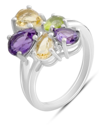 Каблучка 925 проби з натуральним аметистом, хризолітом, цитрином, фіанітами. Вага прикраси 4,69г. Фізичний розмір виробу (висота * ширина): 12х20мм. Країна походження: Індія. Вид покриття: Родій. Розмір виробу: 17. Родовані прикраси довше зберігають свій первісний стан, а саме колір та блиск металу. Всі ювелірні вироби, представлені на нашому сайті, пройшли внутрішній контроль якості, а також контроль державної пробірної служби України, на всіх виробах стоїть відповідна проба. До кожної ювелірної прикраси додаються бірка із зазначенням усіх параметрів. Кольори виробів на сайті можуть трохи відрізнятися від реальних через особливості кольору екрану.