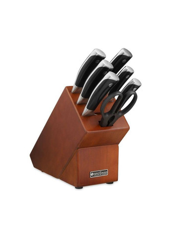 Набір кухонних ножів Grossman Diaman складається з: Шеф-ніж - 330 мм Хлібний ніж - 330 мм Ніж для нарізки м'яса - 325 мм Сантоку - 310 мм Універсальний ніж - 235 мм Ніж для очищення овочів та фруктів - 190 мм Кухонні ножиці - 207 мм Переваги набору: Diaman – класичний набір якісних ножів для кухні Ножі виготовлені із нержавіючої сталі марки 1.4116 від німецької компанії Tussen Krupp AG. Це дійсно якісна європейська сталь. Класичний дизайн. Поліроване дерево - екологічний та солідний матеріал. Ножі виглядають стильно, а їхні рукояті міцні та зручні. Набір чудово впишеться в інтер'єр сучасної європейської кухні. Міцна конструкція ножа. Клинок переходить повноцінний сталевий хвостовик, що йде на всю довжину рукояті (така конструкція ножа називається "фултанг"). Міцні, стильні та при цьому зручні рукояті. Їхній легкий вигин дозволить менше напружувати кисть руки під час нарізування продуктів. Красива та практична підставка з натурального дерева. Виймати та вкладати ножі легко та зручно, їх рукояті повернуті до вас, а не в стелю. Підставка компактна та стійка. Дренажні отвори в дні оберігають ножі від скупчення стікає з їх клинків води. Німецька нержавіюча сталь 1.4116 значно перевершує ті безіменні марки сталей, з яких виготовлено більшість ножів на полицях наших супермаркетів. Ножі з неї не іржавіють, не тьмяніють, точать гостро, ріжуть добре, не тупляться довго. Недарма безліч кухонних ножів та медичних різальних інструментів у Європі, виготовлені саме з 1.4116 від Tussen Krupp AG. Шеф-ніж Шеф-ніж входить до так званої «великої трійки кухонних ножів». До неї крім нього входять ще універсальний та фруктовий ножі. Але про них поговоримо трохи нижче. Шеф – найбільший із усіх. І найвідоміший. Це – головна зброя праці шеф-кухаря. Їм можна нарізати практично все й у будь-яких кількостях. Особливо якщо врахувати, що даний конкретний ніж зроблений якісно з відмінної німецької сталі. Сантоку Санток - японський варіант шеф-ножа. Також дуже ефективний та зручний у роботі. Останнім часом такі ножі стають дедалі популярнішими. І не дарма. Обов'язково спробуйте щось нарізати. Ніж для нарізки м'яса Цей ніж схожий на невеликий прямий меч. Він створений, щоб в один легкий рух нарізати акуратними шматочками м'ясо, шинку чи ковбасу. Всі розрізи будуть рівними та акуратними, а всі шматочки рівними та однаковими. Універсальний ніж Якщо на професійній кухні більше роботи перепадає шеф-ножу, то домашньої куди частіше знаходиться робота для універсала. Цей ніж оптимальний по довжині та вазі. Він не дуже великий і громіздкий, але й не дуже малий і короткий. Саме ці якості роблять ніж універсальним. Адже різати їм можна практично все, що завгодно. Ніж для нарізки хліба Цей ніж досить сильно відрізняється від решти. Його довгий пилкоподібний меч дозволить акуратно розрізати свіжий хліб або булку, розділити торт. Саме те, що ви пилятимете, а не тиснути і різати, дозволить зробити все чисто і без пошкоджень. Ніж для очищення фруктів та овочів Навіть такому маленькому ножу за грамотного підходу знайдеться маса роботи. Їм знімають шкірку з яблук і шкірку з цитрусових, чистять картоплю, видаляють з неї вічка і насіння з інших плодів. А які дива за допомогою його маневреного клинка творять майстри – тема для окремої великої розмови! Кухонні ножиці Ножиці є практично на будь-якій кухні. Чого ними тільки не роблять. Від р