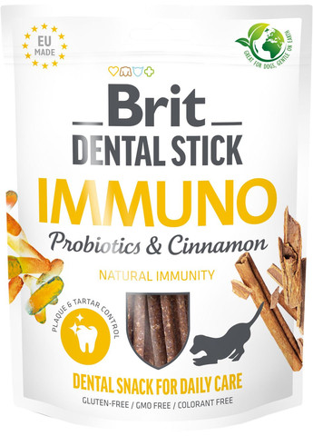 Снеки з пробіотиками та корицею для щоденного догляду за зубами собак. Піклуються про природний імунітет улюбленців. Brit Dental Stick спеціально створені для догляду за зубами песиків, ці функціональні ласощі ідеально підходять для щоденного споживання. Їхня структура розроблена для механічного очищення зубів, а гексаметафосфат натрію (SHMP) виконує функцію зубної пасти. М'ята – антимікробні властивості та свіже дихання Пробіотики (Lactobacillus) – підтримка імунітету Кориця – протизапальний ефект β-глюкани – здоров'я кишечника та мікрофлора SHMP – здоров'я зубів, профілактика утворення зубного каменю Без глютену, без ГМО, без барвників Склад: вівсяне борошно, гліцерин рослинного походження (14%), картопляний крохмаль (10%), гідролізовані дріжджі (5%), червона сочевиця (4%), лігноцелюлоза (3%), патока (3%), сушена кориця (2%), сушений чебрець (1%), сушена м'ята (0,5%), β-глюкани (0,3%), гексаметафосфат натрію (0,3%), інактивовані бактерії та їх частини (Lactobacillus helveticus HA – 122, 15x109 клітин/кг). Аналітичний склад: сирий білок 9,0%, сирий жир 3,5%, сира зола 2,4%, сира клітковина 4,1%, вологість 17,0%, кальцій 0,1%, фосфор 0,2%, натрій 0,05%. Харчові добавки на 1 кг: вітамін C (3a312) 35 мг. Енергетична цінність: 3 010 ккал/кг. Рекомендації з годування: пропонуйте 1 шматочок на день вашій собаці як частування або нагороду. Упаковка: 7 шт.