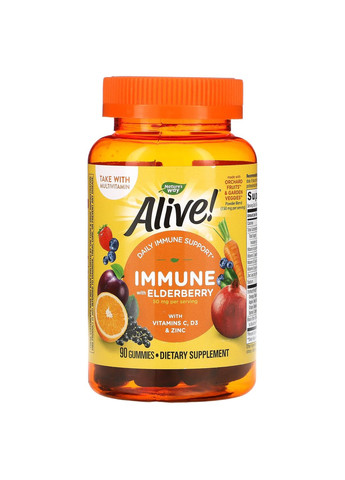 Основні переваги: Alive! Immune Gummies, Nature's Way, 90 жувальних пігулок Жувальні вітаміни Alive! Immune Gummies – це поєднання ключових вітамінів і мінералів, таких як вітаміни A, C, D3, E та цинк, для підтримки нормального стану організму Розмір порції: 3 жувальні таблетки Кількість порцій: 30 Кількість на порцію % від добової потреби† Калорії 25 Всього вуглеводів 6 г 2%† ** Усього цукру Вітамін А (ретинілпальмітат) 900 мкг 100% Вітамін С (аскорбінова кислота) 135 мг 150% Вітамін D3 (холекальциферол) 30 мкг 150% Вітамін Е (ацетат d-альфа-токоферолу) 15 мг 10 мг Натрій 25 мг 1% Суміш фруктів та овочів порошки: апельсин, чорниця, морква, слива, гранат, полуниця, груша, яблуко, буряк, малина, ананас, гарбуз, вишня, цвітна капуста, виноград, банан, капуста, помідор, асаї, спаржа, спаржа, спаржа брокколі, шпинат 150 мг ** Екстракт чорної бузини (Sambucus nigra L.) (ягоди), стандартизований за BioActives®, з 3,2 г ягід бузини вищого гатунку 50 мг ** † Відсоток від добової потреби заснований на дієті в 2000 калорій. ** Добову потребу не визначено.