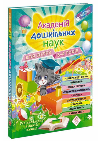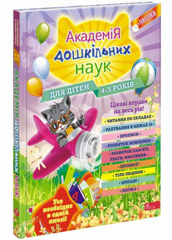 Завдання подаються у міру ускладнення та орієнтовані на реальні можливості дітей, а яскраві ілюстрації та веселі вправи допоможуть розвинути їхні інтелектуальні здібності. У пригоді стануть яскраві наліпки, які допоможуть зацікавити дитину та налаштують її на позитивний результат. «Академія дошкільних наук для дітей 4-5 років» замінить велику кількість посібників для розвитку і протягом тривалого часу буде настільною книжкою малюка. Усе необхідне в одній книзі!
