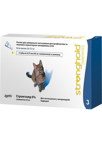 Розчин для зовнішнього застосування у пластикових тубах. Склад: 1 мл препарату містить діючу речовину: селамектин – 60 мг. Допоміжні речовини: Дипропіленгліколь метил ефір, ізопропіловий спирт, бутилгидрокситолуен. Властивості: Протипаразитарний засіб широкого спектра дії. Ефективний проти: - бліх (дорослі особини, личинки, яйця), зокрема при лікуванні блошиного дерматиту; - вушних кліщів (Otodex Cynotis); - коростяних кліщів (Sarcoptes scabies); - аскарид; токсокар; глисти). Стронгхолд має високий рівень безпеки і не викликає клінічних симптомів навіть у разі 10-кратного передозування. Безпечний для людей. Засіб вологостійкий, через 2 години після нанесення засобу тварину можна купати. Селамектин забезпечує безпечний спосіб знищення паразитів за рахунок взаємодії з рецепторами хлорних каналів, спричиняє припинення нормальної передачі імпульсів у нервово-м'язових синапсах у паразитів, внаслідок чого відбувається їх параліч та загибель. Дози та спосіб застосування: Застосовувати тільки зовнішньо на суху ділянку поверхні шкіри у рекомендованій разовій дозі щонайменше 6 мг/кг. Селамектин зберігає дію протягом 30 днів. Тривала циркуляція та повільне виділення з організму забезпечує тривалий період напіввиведення – 8 діб для котів та 11 діб для собак. Препарат наносять на суху шкіру між лопатками у наступних дозах: Коти: маса тіла - 2.6 - 7.5 кг Колір ковпачка - Блакитна Доза д.р. на тварину – 45 мг Концентрація – 6% Номінальний об'єм туби – 0.75 мл Використовується також як компонент терапії при лікуванні блошиних алергічних дерматитів. Можна застосовувати вагітним тваринам та в період лактації. Не застосовувати тваринам віком до 6 тижнів, а також виснаженим та хворим тваринам.