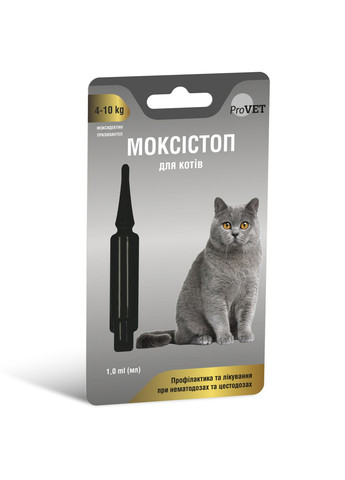 Профілактика та лікування кішок у разі нематодозів (Toxocara cati, Toxascaris leonine, Ancylostoma tubaeforme, Uncinaria stenocephala, Trichuris vulpis, Angiostrongylus vasorum, Crenosoma vulpis, Thelaria callipaeda), цестозу (Dipolinousin cusinus, sp) і змішаних нематодо-цестодозних інвазій. Профілактика дирофіляріозу (Dirofilaria immitis, Dirofilaria repens мікродирофілярії L3 і L4 стадії). «Моксістоп» належить до комбінованих протипаразитарних препаратів. Комбінація моксидектину та празіквантелу, які входять до складу препарату, забезпечують широкий спектр протипаразитарної дії, зокрема проти личинкових і статевозрілих стадій розвитку кишкових нематод, личинок (мікродирофілярій) нематод типу Dirofilaria immitis, Dirofilaria repens, кісто на патах. Моксидектин — напівсинтетичне з'єднання другого покоління макроциклічних лактонів групи мильбеміців. Речовина має активну дію проти ендопаразитів. Механізм впливу зумовлений взаємодією з гамма-аміномасляною кислотою й глутаровими хлорними канальцями паразитів, що призводить до відкриття хлорних канальців у постсинаптичному просторі та збільшення іонів хлору, внаслідок чого відбувається незворотне зниження м'язової активності, параліч і загибель паразитів. Празиквантел активний проти цестоду (стібкових гельмінтів), підвищує проникність мембран для іонів кальцію, викликає підвищення м'язової активності, яке змінюється скороченням мускулатури та спастичним паралічем, викликає руйнування зовнішнього покриву цестод статевозрілих форм. Під дією празіквантелу тропічні гельмінти майже повністю перетравлюються й не виявляються у фекаліях. Препарат наносять на суху неушкоджену шкіру. На ділянці шиї біля основи черепа розгортають шерсть тварини, щоб було видно шкіру, відламують верхню частину піпетки та розміщують кінець піпетки на шкірі, вичавлюють вміст піпетки безпосередньо на шкіру. Під час оброблення тварин великих розмірів вміст піпетки наносять на шкіру в 3-4 точках уздовж хребта. Для дегельмінтизації тварин у разі нематодоз і цестодозів травного тракту препарат застосовують з лікувальною метою одноразово, з профілактичною — один раз на місяць. Для профілактики дирофіляріозу в несприятливих регіонах препарат застосовують у весняно-літньо-осінній період: перед початком літа комарів і москітів (переносчиків Dirofilaria immitis, Dirofilaria repens) одноразово та далі один раз на місяць. Останній раз не раніше, ніж за місяць після завершення літа комах. Препарат не знищує статевозрілих дирофілярій, але знижує кількість циркулювальних у крові мікродирофілярій. Протипоказання: Не застосовують кошенятам віком до 7 тижнів. Не застосовують тваринам із підвищеною чутливістю до складників препарату. Не підлягають дегельмінтизації виснажені та хворі на інфекційні захворювання тварини. Умови зберігання: Зберігати препарат у закритому пакованні виробника, у сухому, недоступному для дітей і тварин місці, окремо від харчових продуктів і кормів, за температури від 5 до 25 °C. Склад: 1 мл препарату містить активні речовини: празиквантел — 40 мг, моксидектин — 10 мг. Допоміжні речовини: ПЕГ-400, ізопропіловий спирт, диметилсульфоксид. Термін придатності: 3 роки. Форма випуску: полімерні піпетки по 1,0 мл, упаковані в картонну коробку по 1 штуці. РП No АВ-09441-03-21. Сертифікат ISO 9001:2015, GMP.
