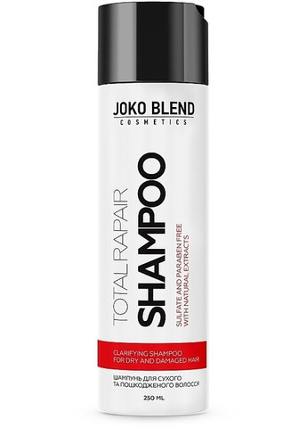 Скрупульозно ставитеся до вибору косметики і ретельно стежите, щоб її склад був максимально безпечним? У такому випадку безсульфатний шампунь для сухого і пошкодженого волосся призначений саме для вас. Total Repair Shampoo від бренда Joko Blend створений на основі збалансованої формули, у складі якої представлені натуральні компоненти: екстракти календули, липи та хітозану, а також кокосове масло. Тому крім ретельного очищення волоссю забезпечений делікатний догляд, адже засіб живить та відновлює структуру пасом. Особливості Joko Blend Total Repair Shampoo: - підходить для використання після фарбування, випрямлення або хімічної завивки; - можна застосовувати щодня; - ретельно очищає від забруднень, залишків стайлінгових засобів і олійних масок; - має приємний аромат; - дарує приємне відчуття чистоти та свіжості; - не обтяжує волосся і запобігає втраті вологи; - захищає від негативного впливу зовнішніх факторів; - не містить сульфатів та парабенів; - робить пасма блискучими та міцними.
