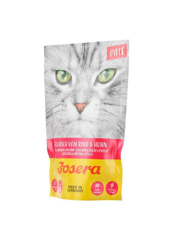Josera Paté не містить шкідливих, штучних харчових добавок: ароматизаторів, консервантів, барвників, а також продуктів, на яких у кішок з чутливим травленням часто виникають алергічні реакції та інші проблеми зі здоров'ям: сої, глютена (зернових), цукрів, молочних продуктів та пальмової олії. Оформити замовлення на смачний вологий корм Йозера найзручніше он-лайн. Особливості та переваги: повноцінний беззерновий корм; підходить для кішок із чутливим травленням; виготовлений виключно із свіжих, натуральних інгредієнтів; високий вміст м'яса та м'ясних субпродуктів; не містить глютену, сої, пальмової олії, цукрів, молочних продуктів; не містить штучних барвників, ароматизаторів та консервантів; контроль рН сечі; профілактика утворення каменів у сечовивідних шляхах та нирках; містить харчові волокна, що перешкоджають утворенню вовняних грудочок в органах шлунково-кишкового тракту. Склад: яловичина (складається із сердець, м'яса, легень та печінки) 40,0 %; курка (складається із сердець, м'яса, печінки, шлунків та шийок) 30,0 %; курячий бульйон; морква; мінерали; лососева олія 0,20%; висівки насіння подорожника (Psyllium). Аналітичні складові в 1 кг: протеїн 10,6%; жир 7,0%; сира клітковина 0,4%; сира зола 2,5%; вологість 79%. Добавки: Харчові добавки в 1 кг: 200 М.А. Вітамін D3; 20 мг Вітамін Е; 1.500 мг Таурін; 25,0 мг Цинк (сульфат цинку, моногідрат); 1,40 мг Марганець (Марганець (II) сульфат, моногідрат); 0,75 мг Йод (Кальція йодат, безводний). Рекомендовані норми годівлі: Вага кішки Добова норма корму, павуків/доба 2-3 кг 2-2,5 шт. 3-4 кг 2,5-3 шт. 4-5 кг 3,5-4 шт. 5-7 кг 4-4,5 шт. * Рекомендована добова кількість корму: дивіться на упаковці. Кількість споживаного корму також має співвідноситься з індивідуальним рівнем активності вашого вихованця. У тварини завжди має бути доступ до чистої, питної води. Умови зберігання: після розтину зберігати в холодильнику при температурі 2-6 °C та використовувати протягом 24 годин. Фасування: 85 г