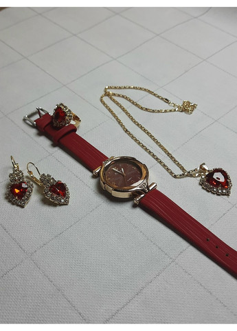 Набір гарнюня 4 в 1 Колір: червоний. У наборі - кулон з ланцюжком, сережки, обручка та годинник. Пакування немає код 002