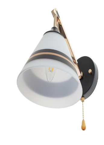 Бра LK-701W / 1 E27 BK + FG має прості геометричні форми. Конусоподібний плафон, спрямований вниз, зроблений з білого непрозорого скла. На стінки нанесена широка чорна смуга із золотистою вставкою посередині. Корпус виготовлений з металу чорного кольору з елементами латуні. У нижній частині пристрою є вимикач на ланцюжку, який виступає додатковим декоративним елементом. Конструкцією передбачено використання світлодіодним, енергозберігаючої або звичайної лампочки розжарювання з цоколем Е27 і максимальною потужністю 60 Вт. Світильник цієї моделі буде забезпечувати м'яке розсіяне світло локального типу. Бра підійде для освітлення житлового інтер'єру, кафе, номера готелю або торгового приміщення.
