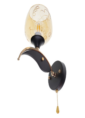 Бра LK-703W / 1 E27 BK + FG ефективне джерело додаткового освітлення. Його корпус зроблений з металу чорного і золотистого кольорів. У нижній половині розташований вимикач на ланцюжку. На зігнутому власники розташований плафон, спрямований вгору. Він виготовлений з прозорого золотистого скла. На стінку нанесений декоративний малюнок в стилі флористика. Конструкцією передбачено використання світлодіодним, енергозберігаючої або звичайної лампочки розжарювання з цоколем Е27 і максимальною потужністю 60 Вт. Світильник цієї моделі буде забезпечувати м'яке розсіяне світло локального типу. Бра підійде для освітлення житлового інтер'єру, кафе, номера готелю або торгового приміщення.