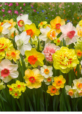 Мікс нарцисів - універсальне рішення для тих, хто хоче отримати яскраву, динамічну клумбу без довгих виборів. Тут можуть бути абсолютно різні види та сорти, а ще у такій суміші ви отримаєте цілу палітру: білі, кремові, жовті та персикові відтінки, різні форми та аромати. Кожна квітка має свою особливість — деякі виглядають як міні-троянди, інші — як повітряні кульки з пелюсток і не забуваємо звичайно ж про класичні та унікальні види та сорти. Це ідеальний варіант для тих, хто хоче, щоб сад сам “грав” кольорами з року в рік. Оскільки в міксі — сорти з різним періодом цвітіння, то клумба не просто спалахне на кілька днів, а буде квітнути хвилями протягом усього весняного сезону. Різноманіття форм — ще один бонус: завдяки йому сад не виглядає одноманітно, а квіти доповнюють одне одного. Такий мікс особливо гарно виглядає у природному стилі — під деревами, між чагарниками, на схилах або уздовж доріжок. Посадивши один раз, ви отримаєте живу весняну композицію, яка не потребує постійного оновлення, але кожного року виглядатиме трохи по-новому. І найприємніше — вам не доведеться вирішувати, який нарцис найкращий. У цьому міксі — вони всі особливо гарні. І пам’ятайте головне: для цієї колекції ми завжди використовуємо цибулини нарцисів найвищої якості, а це означає, що сорти, які ми обираємо для створення цього міксу, можуть трішки відрізнятися. Сорти, використані в цій колекції, можуть не збігатися з сортами нарцисів, зображеними на фото, і можливі незначні відмінності в кольорах. Але розчарованим не залишиться ніхто - в цьому ми запевняємо! Ідеальні умови для вирощування: вирощування нарцисів, як зрештою й інших цибулькових весняноквітучих рослин, не потребує особливих зусиль, але деякі фактори все ж краще врахувати. По-перше, ми говоримо про вибір місця, ґрунту, правильна посадка та догляд після посадки. Пам’ятайте, що нарциси люблять сонячні ділянки, але можуть прекрасно рости і в умовах напівтіні. Ґрунт повинен бути вологим, суглинним, з достатньою кількістю поживних речовин. Не рекомендується садити нарциси в надто кислий ґрунт, бажано нейтральний або слаболужний. А перед посадкою його бажано підживити компостом або перегноєм, а також додати фосфорні та калійні добрива. Найкращий час для посадки нарцисів - осінь, орієнтовно це вересень-жовтень, але зважайте на погодні умови у своєму регіоні. Глибина посадки залежить від розміру цибулин, зазвичай це в 2-3 рази більше за висоту цибулини. На важких ґрунтах глибину посадки можна зменшити, а на легких - збільшити. Після посадки ґрунт можна замульчувати торфом або листям, щоб зберегти вологу. Особливості догляду після посадки дуже прості. Передовсім пам'ятайте, що нарциси вологолюбні рослини, але не переносять застою води. Поливайте їх регулярно, особливо під час активного росту та цвітіння, але стежте, щоб ґрунт не був перезволожений. Вносьте комплексні мінеральні добрива навесні, під час бутонізації та після цвітіння. А також не забувайте щоразу обрізати відсохлі квітконоси та листя, аби рослинка змогла накопичити поживні речовини для наступного сезону. За правильного догляду, нарциси зможуть тішити вас на одному місці понад 8 років!