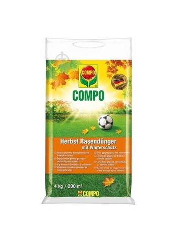 Добриво Compo для газонів осіннє 4 кг 3170 - Тверде добриво тривалої дії Compo для газонів (осіннє). Високий вміст калію обоспечивает витривалість і здоров'я газону, який може швидше і краще здолати мох і бур'янові рослини навесні. Склад поживних речовин адаптований до запитів декоративного і спортивного газону. Осінь добриво використовують, щоб захистити газони впродовж зими. Призначення Для газонів Тип Комплексні Склад Калійні Вид Гранульовані Фасовка Середня упаковка (від 1 до 10 л/кг) Упаковка Пакет Спосіб внесення Підкормове Період внесення Осінь По складу NPK (+MgO); 9+5+14 (+4) Cтрана - виробник: Німеччина, Compo