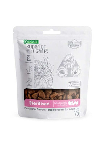 Переваги ласощів для котів Nature's Protection: Високоякісний білок птиці. L-карнітин для контролю ваги. Здорове травлення. Гігієна зубів і ротової порожнини. MicroZeoGen для детоксикації. Підтримка імунітету. Натуральний та безпечний склад. У нас на сайті ви знайдете корисні ласощі для котів, що тішитимуть улюбленців між основними прийманнями та під час веселої гри. Склад: м'ясо птиці 39% (сушене та дрібно подрібнене), рис, кукурудза, кукурудзяна клейковина, пташиний жир, жом цукрових буряків, морські водорості Ascophyllum nodosum, пивні дріжджі, целюлоза (1,5%), поліфосфат натрію, насіння льону, динамічний мікронізований клиноптилоліт (1 %), рибне борошно, сухі яйця, екстракт цикорію, маннанолігосахариди (МОС) (0,9 %), юка мохаве, шрот календули. Добавки: харчові добавки: вітамін А (3a672a) – 12500 МО, вітамін D3 (3a671)* – 938 МО, вітамін Е (3a700) – 344 мг, заліза(ІІ) сульфат моногідрат (3b103) – 31,25 мг, кальцію йодат безводний (3b202) – 0,95 мг, міді(ІІ) сульфат пентагідрат (3b405) – 3,15 мг марганцю сульфат моногідрат (3b503) – 12,5 мг, цинку сульфат моногідрат (3b605) – 71,88 мг, натрію селеніт (3b801) – 0,06 мг, таурин (3a370) – 625 мг, DL-метіонін, технічно чистий (3c301) – 1000 мг, L-карнітин (3a910) – 100 мг. Технологічні добавки: антиоксиданти, консерванти. Аналітичні компоненти: ссирий протеїн – 31 %, сира клітковина – 4 %, сирий жир – 9 %, сира зола – 6 %, кальцій – 0,9 %, фосфор – 0,75 %, калій – 0,8 %, натрій – 0,5 %, магній – 0,06 %, Омега-3 жирні кислоти – 0,25 %, Омега-6 жирні кислоти – 2,51 %. Рекомендації щодо годування: Давати між основними прийомами їжі відповідно до ваги, віку та рівня активності тварини. Біля тварини завжди має бути миска зі свіжою, чистою водою.Підходить для котів старше 3 місяців. Поряд завжди повинна бути миска зі свіжою водою. Вага кішки шт / в день 1-2 10 2-4 15 4-6 20 >6 25 Умови зберігання: Зберігати в сухому та прохолодному місці, захищеному від прямих сонячних променів при температурі не вище +25 ⁰C. Після відкриття упаковки використати протягом 3 днів. Застереження: Не допускається одночасне вживання з вітаміном D2.