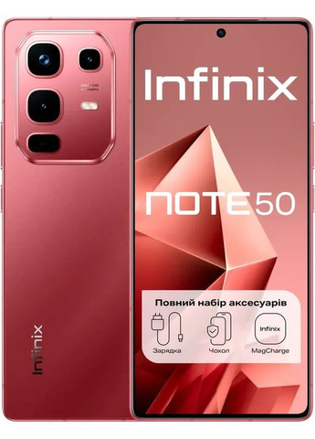 Швидше, розумніше, яскравіше Відкрийте для себе Infinix NOTE 50 – смартфон, створений для тих, хто хоче більшого. Яскравий 6,78-дюймовий дисплей із частотою 144 Гц дарує неймовірно плавну картинку та комфорт у будь-якому сценарії – від перегляду фільмів до ігор. Основна камера на 50 МП з оптичною стабілізацією дозволяє робити чіткі та насичені знімки навіть у русі, а вбудований ШІ допомагає вам використовувати можливості телефону на максимум. Потужний процесор MediaTek Helio G100 Ultimate гарантує швидку та стабільну роботу, а акумулятор на 5200 мАг з підтримкою як швидкої зарядки 45 Вт, так і бездротової MagCharge 30 Вт дозволяє залишатися на зв'язку цілий день. Додайте до цього міцну металеву рамку ArmorAlloy, і ви отримаєте смартфон, готовий до будь-яких повсякденних викликів. Елегантність та міцність у кожній деталі Infinix NOTE 50 створений, щоб не просто тішити око, а вражати з першого погляду. Металева рамка ArmorAlloy™ поєднує в собі естетичність дамаської сталі та легкість авіаційного алюмінію. Камера захищена стильною металевою окантовкою, а покриття корпусу не збирає відбитки пальців, що дозволяє телефону завжди виглядати акуратно. Кожна деталь продумана до дрібниць, навіть інтелектуальна кнопка, яка відкриває миттєвий доступ до розумних функцій. Це смартфон, який хочеться тримати у руках. Вражаючі можливості камери 50 мегапікселів, оптична стабілізація, апертура f/1.88 та великі пікселі – ця камера створена, щоб фіксувати моменти життя в ідеальному світлі. Хочете зняти пейзаж чи зробити круте макро? Просто наведіть — інше зробить ШІ. Він підлаштовує світло, балансує тіні, прибирає зайве, щоб кадри були яскравими, живими та справжніми. Підсвічування Active Halo Коли вмикається фототаймер або запис відео, навколо камери спалахує м'яке підсвічування Active Halo. Це не тільки красиво, але й неймовірно зручно – ви знаєте, коли починається магія зйомки. Продуктивність, яка не знає обмежень Дивіться відео, грайте, спілкуйтесь без пауз. В основі NOTE 50 лежить 6-нм процесор Helio G100 Ultimate, що забезпечує відмінну енергоефективність та стабільну роботу всіх програм. Крім того, можливість розширення оперативної пам'яті до 16 ГБ (8 ГБ вбудованої + 8 ГБ віртуальної) робить багатозадачність справді плавною. А з 256 ГБ швидкої флеш-пам'яті вам точно не доведеться вибирати, що видалити. ШІ, який завжди поруч Довге натискання на кнопку вмикання — і ваш розумний помічник вже у справі. Він розуміє ваші запити, створює нотатки, шукає фото за описом, редагує текст, прибирає зайві об'єкти з фото та навіть резюмує документи чи розмови. Це як персональний помічник, тільки швидше і точніше. Дисплей, від якого неможливо відірватися AMOLED-екран NOTE 50 із частотою 144 Гц буквально оживає у вас на долоні. Він демонструє плавну, яскраву та глибоку картинку, що ідеально підходить для геймерів та поціновувачів кіно. Підтримка до 90 FPS в іграх, знижене випромінювання синього кольору та сертифікація TÜV Rheinland роблять його не тільки красивим, але й комфортним для очей. А підекранний сканер відбитків дозволяє швидко, зручно і без зайвих рухів розблокувати телефон. Відчуйте візуальну насолоду при кожному погляді та кожному дотику до смартфона. Об'ємний звук, як у кінотеатрі Завдяки стереодинамікам від JBL ви почуєте кожну деталь — будь це лункий бас, кроки у грі чи голос улюбленого виконавця. А симетричне звучання на 360 ° створює ефект