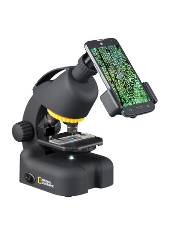 National Geographic 40x-640x (з адаптером для смартфона) є сучасним мікроскопом для навчання. Мікроскоп укомплектований великою кількістю різних аксесуарів, готових для перегляду слайдів, оснащений револьверною головкою з трьома об'єктивами, що дають в комплексі з зум-окуляром збільшення до 640х. Відмінною рисою цього мікроскопа є адаптер для камери смартфона. За допомогою адаптера для смартфона, що йде в комплекті з мікроскопом, легко фотографувати об'єкти спостережень на камеру вашого смартфона. Торгова марка National Geographic сьогодні відома в найвіддаленіших куточках нашої планети. Національне географічне суспільство здобуло собі славу завдяки своїм поглибленим дослідженням навколишнього світу та популяризації своїх відкриттів та спостережень. Нині компанія National Geographic співпрацює з найкращими виробниками товарів у всьому світі. Результат цієї співпраці - розробка та виробництво приладів, що дозволяють вивчати навколишнє середовище, а також ряду товарів, заснованих на технологіях, безпечних для навколишнього середовища. . Окуляр оснащений м'яким гумовим наглазником, завдяки чому унеможливлюється травмування очей при необережному русі. Оскільки дана модель поставляється з широким набором аксесуарів - це дозволяє негайно приступити до досліджень в домашніх умовах без додаткових витрат часу і грошей. Рекомендується розпочати спостереження з об'єктива мінімальної кратності, встановивши зум-окуляр так само мінімальну кратність. Таким чином буде досягнуто кращої якості зображення. За потреби - змінюйте об'єктиви та положення зум-окуляра, домагаючись більшого збільшення. У комплектацію входить адаптер для камери смартфона. Адаптер кріпиться на тубусі мікроскопа та дозволяє проводити фото та відеозйомку основною камерою смартфона незалежно від її місця розташування. Новий смартфон-адаптер тепер дозволяє надійно закріпити смартфон, незалежно від того, чи є тильна поверхня гаджета гладкою або рифленою. Для живлення підсвічування надовго вистачає двох батарей типу АА, що не обмежує використання мікроскопа в польових умовах. Діафрагма з різними отворами дозволяє направити необхідну кількість світла на зразок, залежно від об'єктива, що використовується.