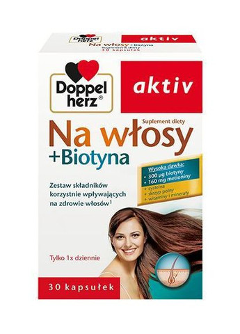 Doppelherz aktiv “На волосся і нігті + Skrzyp” — це дієтична добавка, що поєднує натуральний екстракт хвоща польового (Skrzyp polny), масло зародків пшениці, екстракт проса, цинк, біотин, вітаміни групи B, мідь та інші корисні речовини. Завдяки цьому комплекс діє багатосторонньо: зміцнює структуру волосся і нігтів, зменшує їх ламкість, сприяє природному росту та покращує стан шкіри. Формула особливо підходить людям, які стикаються з проблемою випадіння волосся, ламкості нігтів, тьмяної шкіри чи підвищеного навантаження на організм. Призначення Зміцнення волосся та стимуляція їх росту. Запобігання ламкості та розшаруванню нігтів. Підтримка здорової пігментації волосся. Живлення шкіри антиоксидантами та вітамінами. Підвищення еластичності та блиску волосся. Склад (на 1 капсулу) Екстракт хвоща польового — 100 мг Масло зародків пшениці — 250 мг Екстракт проса — 150 мг Пара-амінобензойна кислота (PABA) — 30 мг L-цистеїн — 5 мг L-метіонін — 5 мг Вітамін С — 80 мг (100% РДН) Ніацин (В3) — 8 мг (50% РДН) Пантотенова кислота (В5) — 6 мг (100% РДН) Вітамін В6 — 1,4 мг (100% РДН) Біотин (В7) — 75 мкг (150% РДН) Цинк — 10 мг (100% РДН) Мідь — 0,5 мг (50% РДН) Допоміжні речовини: желатин, гліцерин, соєва олія, бджолиний віск, соєвий лецитин, барвники (оксиди заліза). Опис складу Skrzyp (хвощ польовий) — природне джерело кремнію, зміцнює волосся і нігті. Масло зародків пшениці — живить та захищає від ламкості. Просо — містить білки й амінокислоти, що покращують структуру волосся. PABA — підтримує пігментацію волосся. Цинк — відповідає за здоровий ріст і відновлення волосся та нігтів. Біотин — «вітамін краси», зменшує ламкість і покращує блиск. Мідь — сприяє природному кольору волосся. Вітамін С — антиоксидант, стимулює синтез колагену. Вітаміни В6, В5, В3 — покращують живлення клітин і обмін речовин. Застереження Приймати по 1 капсулі на день після їжі, запиваючи водою. Рекомендований курс — мінімум 3 місяці. Не перевищувати добову дозу. Не є замінником повноцінного харчування. Протипоказано при індивідуальній непереносимості компонентів, у вагітних та годуючих жінок — тільки після консультації з лікарем.