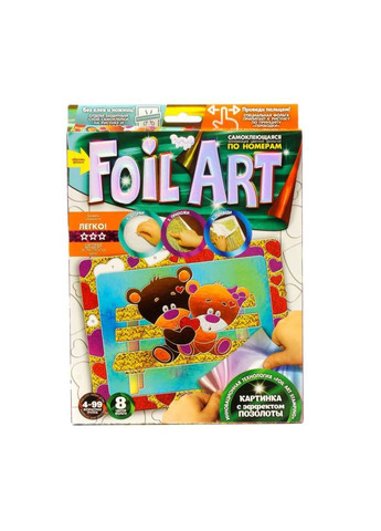 " " аплікація, що самоклеїться кольоровою фольгою за номерами. Це набори для дитячої творчості, що розвивають моторику рук, художній смак, долучаючи до мистецтва. Прекрасно підходять для дітей молодшого та шкільного віку. Завдяки застосуванню інноваційної технології " " ви зумієте без особливих зусиль і навичок створити чудову картину з ефектом "позолоти". Нові матеріали, що використовуються в даному наборі, гарантують захоплююче заняття та неперевершений результат. М'яка фольга проста у використанні та на відміну від жорсткої металізованої фольги не травмує і не ріже руки. Вам не знадобляться клей та ножиці, все що потрібно, вже є у нашому наборі. Характеристики: - Вага товару: 0.15 - Габарити: довжина: 30 - Габарити: ширина: 1.5 - Габарити: висота: 22 - Стан: нове - Вікова група: Від 4 років - Матеріал: Комбінований - Колір: Різні кольори - Упаковка: Картонна коробка - Вид: Набір для творчості - Вік: Від 4 х років - Гарантія: 14 днів - Стать: Унісекс - Країна реєстрації бренду: Україна - Країна-виробник товару: Україна - Найменування різновиду: Пара ведмежат