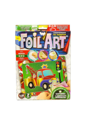 " " аплікація, що самоклеїться кольоровою фольгою за номерами. Це набори для дитячої творчості, що розвивають моторику рук, художній смак, долучаючи до мистецтва. Прекрасно підходять для дітей молодшого та шкільного віку. Завдяки застосуванню інноваційної технології " " ви зумієте без особливих зусиль і навичок створити чудову картину з ефектом "позолоти". Нові матеріали, що використовуються в даному наборі, гарантують захоплююче заняття та неперевершений результат. М'яка фольга проста у використанні та на відміну від жорсткої металізованої фольги не травмує і не ріже руки. Вам не знадобляться клей та ножиці, все що потрібно, вже є у нашому наборі. Характеристики: - Вага товару: 0.15 - Габарити: довжина: 30 - Габарити: ширина: 1.5 - Габарити: висота: 22 - Стан: нове - Вікова група: Від 4 років - Матеріал: Комбінований - Колір: Різні кольори - Упаковка: Картонна коробка - Вид: Набір для творчості - Вік: Від 4 х років - Гарантія: 14 днів - Стать: Унісекс - Країна реєстрації бренду: Україна - Країна-виробник товару: Україна - Найменування різновиду: Машина