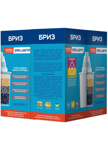 Підходить до фільтрів-глечиків Бриз і Бар'єр Унікальна конструкція змінного картриджа забезпечує легкість його заміни та необхідну швидкість протоку води. Картридж здійснює багатоступеневе очищення води. Він видаляє механічні домішки: іржу, пісок; солі жорсткості та з'єднання хлору. У процесі фільтрації повністю усувається неприємний запах і присмак. Очищена вода чудово підходить для пиття та приготування їжі. Використовувані матеріали та компоненти виготовлені з нетоксичних матеріалів, допущених для контакту з питною водою та відповідних вимог ТУ У 29.2-2648400275-001:2011 Склад картриджа: спеціальні іонообмінні смоли волокнисті іонообмінні матеріали кокосове активоване вугілля кокосове активоване вугілля, оброблене сріблом Комплект постачання: Пакувальна коробка — 4 шт. Змінна касета в герметичному пакованні — 4 шт. Продуктивність: Продуктивність (витрата води) не менш ніж 3 л/год. Ресурс змінної касети 350 літрів* У разі споживання до трьох літрів води на людину на день середня тривалість роботи однієї змінної касети: для 1 особи — 90 днів для сім'ї з 2 осіб — 50 днів для сім'ї з 3 осіб — 30 днів для сім'ї з 4 осіб — 25 днів *Ресурс змінної касети залежить від якості вихідної води. Змінні картриджі: Картридж «БРИЗ Стандарт +» призначений для високоякісного очищення водопровідної води від сполук хлору, хлорорганіки, іржі, органічних домішок, усунення запаху та поліпшення смаку води. Картридж підходить для фільтрів глечиків Бар'єр ЕКСПЛУАТАЦІЯ Перед початком використання ретельно промийте лійку, глечик і кришку слабким мильним розчином, промийте чистою водою і витріть насухо. Замочіть змінний картридж у воді на 15-20 хв. Вийміть картридж із води та вставте його в лійку до упору, наповніть лійку фільтра холодною водою, злийте перші дві порції очищеної води. У разі регулярного використання не залишайте фільтр без води. У зимовий період, а також під час використання води з бульбашками повітря, можливе зниження швидкості протікання води через картридж. У такому разі витягніть змінний картридж і кілька разів струсіть його. Рекомендации: не використовуйте фільтр для очищення води, небезпечного в мікробіологічному співвідношенні застосовуйте фільтр тільки за призначенням не рідше ніж один раз на місяць промивайте лійку та глечик фільтра слабким мильним розчином, обполіскуйте чистою водою і витирайте насухо не допускайте тривалого перебування фільтра під прямим сонячним промінням у разі тривалих перерв у роботі фільтра (понад тиждень) відфільтровану воду злийте, а деталі фільтра протріть насухо чистим рушником. Перш ніж знову почати використовувати фільтр, повторіть процедуру підготовки фільтра до роботи Переваги застосування змінного картриджа Бриз Стандарт+ Привабливе поєднання вартості картриджа та якості води, що очищається, можливість встановлення в фільтри-глечики аналогічних конструкцій. СВІЙСТВО ХАРАКТЕРИСТИКА Висота 143 мм Ширина 62 мм Глибина 62 мм Висота картриджа 125 мм Діаметр картриджа 60 мм Температура води, що очищається + 4 ° ... + 38 °С Розмір коробки 62x62x143 мм Термін зберігання 3 роки Тип Картридж для глечика Тип фільтрації Ум'якшення, видалення хлору/органіки Призначення Для глечика