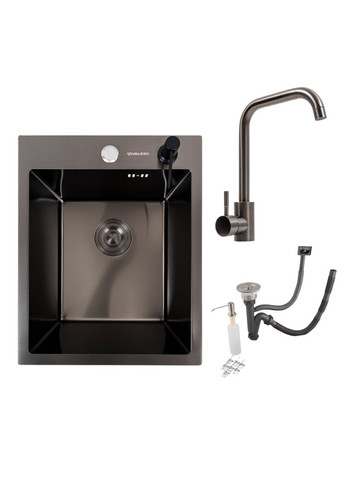 Кухонний комплект: Мийка Valeso Handmade (40x50 см) PVD чорна + Змішувач FC-5 PVD чорний Цей кухонний комплект Valeso — це стильне та функціональне рішення для вашої кухні, що об'єднує мийку та змішувач в елегантному PVD чорному кольорі. Комплект ідеально підійде для компактних кухонь, де цінується сучасний дизайн та висока надійність. На весь комплект поширюється гарантія 1 рік. Особливості комплекту Цей комплект вирізняється своїм PVD чорним покриттям, яке надає йому розкішного та сучасного вигляду. PVD (Physical Vapor Deposition) — це передова технологія нанесення покриттів, що забезпечує неперевершену стійкість до зносу, корозії та вицвітання. Завдяки цьому покриттю, мийка та змішувач не лише виглядають ефектно, але й зберігають свій первісний вигляд протягом багатьох років, не втрачаючи блиску та кольору. Що входить до комплекту? До цього комплекту включено: Кухонна мийка Valeso Handmade (40x50 см) з PVD чорним покриттям Змішувач Valeso FC-5 з PVD чорним покриттям Дозатор для миючого засобу Сифон (круглий) Повний набір кріплень для мийки та змішувача Кухонна мийка Valeso Handmade PVD чорна Ця компактна та елегантна мийка, розміром 400x500x230 мм, ідеально підходить для невеликих кухонь, дозволяючи оптимізувати простір. Глибока чаша у 230 мм забезпечує зручність при митті посуду. Мийка виготовлена з високоякісної нержавіючої сталі SUS 201 з товщиною 3.0 мм для основного корпусу та 0.8 мм для стінок, що гарантує її виняткову міцність та довговічність. Головною особливістю є її PVD чорне покриття, яке не лише надає мийці розкішного вигляду, але й забезпечує підвищену стійкість до подряпин, корозії, потемніння та вапняного нальоту, значно спрощуючи догляд. Мийка стійка до високих температур та побутової хімії. Її лаконічний та оригінальний дизайн гармонійно впишеться у будь-який сучасний інтер'єр. Змішувач Valeso FC-5 PVD чорний Цей стильний та функціональний змішувач ідеально доповнює мийку, забезпечуючи комфортне та точне регулювання води. Він виконаний з високоякісної нержавіючої сталі SUS304 з PVD чорним покриттям, яка відома своєю міцністю, довговічністю та стійкістю до корозії. Оптимальна висота змішувача у 280 мм та довжина виливу у 155 мм забезпечують зручність у використанні. Висота від основи до носика становить 200 мм, що дозволяє легко наповнювати високі ємності. Картридж на 35 мм гарантує плавне та точне регулювання температури та напору води. Сучасний та елегантний дизайн змішувача гармонійно вписується у будь-який кухонний інтер'єр. Чому варто обрати цей комплект? Комплексне рішення: Ви отримуєте все необхідне для облаштування робочої зони мийки в одному наборі. Довговічність та стійкість: Завдяки високоякісній нержавіючій сталі та PVD покриттю, мийка та змішувач прослужать довгі роки, зберігаючи свій первісний вигляд. Естетика: Елегантний PVD чорний колір створює сучасний та розкішний акцент на вашій кухні. Зручність: Глибока чаша мийки, оптимальна висота змішувача та наявність дозатора роблять щоденне використання максимально комфортним.