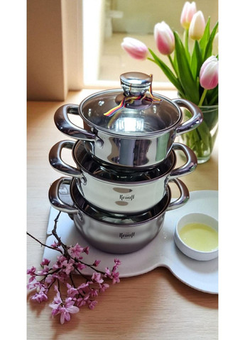 . Каструля Meyer . Об'єм: 5.5 л . Діаметр: 24 см . Матеріал: нержавіюча сталь . Наявність кришки: так Зовнішній вигляд пакування може відрізнятися від фото RINGEL - бренд якісного посуду та аксесуарів для здорової смачної їжі! Торгова марка RINGEL - приклад кращого досвіду європейських виробників посуду і вміння забезпечити максимум якості за прийнятною ціною. Посуд бренду RINGEL - ідеальний помічник на вашій кухні, щодня буде надихати вас на справжні кулінарні шедеври! RINGEL поєднав кращий досвід, сучасні технології та актуальні тенденції у сфері виготовлення металевого посуду. Саме тому ми сміливо заявляємо, що наші вироби дарують споживачу найкраще поєднання ціни і якості за умови, що якість завжди була, є і буде на першому місці. Асортимент продукції бренду RINGEL повністю задовольняє потреби в посуді та приборах найвимогливішої господині. До того ж, зовнішній вигляд усього посуду ТМ RINGEL витриманий в універсальній концепції стриманого та лаконічного дизайну, дозволяє самостійно комбінувати поєднання посуду на кожній окремій кухні. Всі каструлі RINGEL вироблені за найновітнішою технологією зберігання тепла. Потовщене капсульне дно швидко та рівномірно передає тепло страві, що дозволяє скоротити час на приготування та зберегти максимум корисних речовин у стравах. А потовщені стінки каструль RINGEL забезпечують максимально довге утримання страви теплою, без необхідності додаткового розігрівання. Колекція посуду Meyer виконана з високоякісної нержавіючої сталі, безпека якої підтверджена європейськими сертифікатами з товщиною стінок 0.5 мм. Дана лінійка відрізняється зовнішньою і внутрішньою дзеркальною поліровкою. Внутрішні позначки літражу допоможуть з легкістю готувати кулінарні шедври, точно слідуючи рецепту. Набір каструль включає в себе три оптимальні розміри каструль, які можуть стати в нагоді для щоденного використання. Потрійне капсульне дно забезпечує рівномірний розподіл тепла по дну та стінкам каструлі. Ергономічні ручки виконані з нержавіючої сталі із силіконовими накладками сірого кольору, які перешкоджають нагріванню. Мають надійне клепочне кріплення, яке забезпечить комфорт і безпеку під час приготування. До переваг також можна віднести функціональну кришку, яка оснащена отвором для випускання пари та металевим обідком, який забезпечує довговічність продукції. Особливості каструль MEYER: Провідна технологія зберігання тепла Потрійне капсульне дно Товщина стінок каструлі 0.5 мм Матеріал продукції - високоякісна нержавіюча сталь Зовнішня і внутрішня дзеркальна поліровка корпусу Ручки з нержавіючої сталі із силіконовими накладками Надійне клепочне кріплення аксесуарів для безпеки використання Кришка із жаростійкого скла з отвором для випуску пари та металевим обідком Внутрішні позначки літражу Підходить для всіх видів плит, включаючи індукційні Підходить для використання в посудомийних машинах