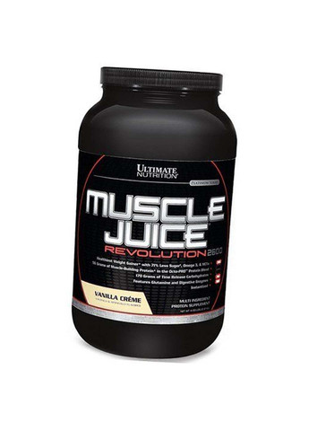 Muscle Juice Revolution – перевірена просунута формула для набору маси з чудовим смаком! Все дуже просто - це найкалорійніший і з найкращим смаком гейнер на ринку. Muscle Juice Revolution від Ultimate Nutrition – це неперевершений гейнер на ринку спортивного харчування. Його особливість - це 56 г протеїну в ексклюзивній протеїновій суміші Octo-PROTM, що комбінує в собі 8 ключових протеїнів. Він містить 170 г вуглеводів повільного засвоєння, таким чином, вдається подовжити час засвоєння вуглеводів, щоб мінімізувати здуття живота. На додаток до прекурсів глютаміну, що містяться в протеїні, ви отримуєте 1000 мг. глютаміну в кожній порції, який містить передовий L-аланіл-L-глютамін. Цей потужний дипептид може захистити ваші м'язи від руйнування та дати паливо на тренуванні, щоб допомогти вам виконати весь об'єм задуманої роботи. Коли ви приймаєте 2 порції на день, як рекомендовано, з молоком, ви отримаєте більше 2600 калорій і більше 148 г протеїну, для допомоги в наборі маси. Протеїнова суміш, для тривалого харчування ваших м'язів, що складається з кількох джерел протеїну, перевершує будь-який однокомпонентний джерело протеїну. Сироваткові протеїни, такі як гідролізат, ізолят та концентрат піднімають рівень амінокислот у вашому організмі одразу після того, як ви вжили їх. Ці протеїни чудово підходять для набору сухої м'язової маси. Далі йдуть білки із середнім засвоєнням. Яєчний протеїн вважається найдосконалішим джерелом протеїну, тому що він містить повний спектр незамінних амінокислот, амінокислот з розгалуженим ланцюгом (BCAA) та глютамінову кислоту. Він легко та в повному обсязі засвоюється організмом. Не всі жири однакові. Muscle Juice Revolution містить суміш корисних жирних кислот, отриманих із найкорисніших олій. Вони з низьким вмістом насичених жирів, високим вмістом мононенасичених жирів з низьким вмістом холестерину, крім цього вони є відмінним джерелом жирів Омега-3 та енергії. MCT`s подібно до вуглеводів витрачаються на енергію, але на відміну від вуглеводів, вони зазвичай не відкладаються в організмі у вигляді жиру. Глютамін - це неперевершений антикатаболік, що запобігає руйнуванню м'язової тканини, що зменшує ступінь пошкодження м'язів і болючість у м'язах. Він допомагає організму виділяти власний гормон росту, який ініціює вивільнення IGF-1 (інсуліноподібний фактор росту 1). Цей гормон сприяє схуднення, збільшення сухої м'язової маси та збільшення щільності кісток. Глютамін також сприяє нейтралізації молочної кислоти, яка згорить у ваших мускалах через виділення плазми бікарбонату, це дозволить тренуватися вам довше і жорсткіше. Він підвищує баланс азоту, що допомагає вам підтримувати позитивний азотистий баланс для раціонального зростання м'язів. Склад: Склад на порцію – 265 г (4 мірні ложки): Калорії – 1020 – в т.ч. калорії від жирів - 80 Усього жирів - 14 р., - у т.ч. насичені жири – 3 г Холестерин – 170 мг Натрій – 150 мг Всього вуглеводів – 170 г, – у т.ч. цукор - 18 г Протеїн - 56 г Кальцій Залізо Octo-PROTM протеїнова суміш - 70 г Концентрат сироваткового протеїну, ізолят сироваткового протеїну, ізолят молочного протеїну, гідролізат сироваткового протеїну, ізолят яєчного протеїну, міцелярний казеїн, концентрат молочного протеїну, кальц. Суміш комплексу вуглеводів тривалого засвоєння - 175 г Кукурудзяний мальтодекстрин, рисовий мальтодекстрин, Karbo-Lyn Суміш корисних жирних кислот - 9 г Олія кан