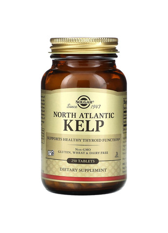 Kelp, Solgar - натуральна кошерна ламінарія (бура водорість з вод Атлантичного океану) без молока, пшениці та глютена - найкраще і найбагатше джерело мікроелементів: калію, кальцію, магнію та йоду, в першу чергу Склад: Розмір порції: 1 таблетка Кількість на упаковці: 250 таблеток (Північноатлантична ламінарія) 200 мкг 133% * Добова потреба не визначена.