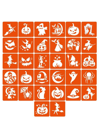 Набір трафаретів для біо-тату "Хелловін №3" Fresh Tattoo hallowween-3-32, 32 трафарети 6х6 см Як зробити біо-тату: виберіть рівномірну ділянку шкіри; добре знежирте його; зніміть із трафарету білу підкладку (паперова основа трафарету); приклейте трафарет на суху та знежирену шкіру; обережно зніміть прозору плівку і переконайтеся, що трафарет (помаранчева частина) щільно приклеєний до шкіри; нанесіть рівномірний шар клею для боді-дизайну та дайте йому просохнути (від 30 секунд до 2 хвилин залежно від шару клею); нанесіть глітер (блискітки) на клей і щільно вбийте його пензлем для глітера; змахніть надлишки гліттера пензлем-кошторисом і зніміть трафарет. Для чого потрібний трафарет: якщо не вмієте малювати від руки; якщо потрібно багато та швидко малювати; потрібно створювати однакові і за розміром, і на вигляд малюнки - скористайтеся трафаретами Fresh Tattoo; трафарети Fresh Tattoo безпечні для шкіри і підходять для нанесення тимчасових тату всіх типів: гліттер-тату, хною, оксамитом, пігментом, джагуа-гелем і так далі; підходять для хімічного або піскоструминного матування виробів зі скла (чашки, келихи, дзеркала);