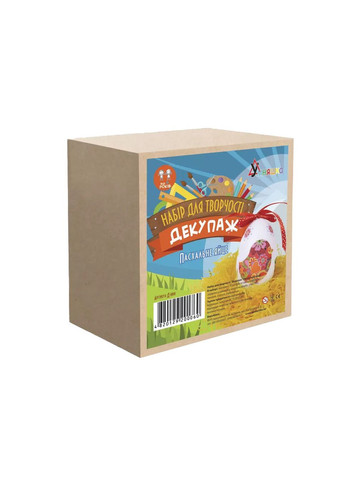 Дитячий захоплюючий набір для творчості. Декупаж "Великоднє яйце" (Д-008) D-008, розроблений з виключно безпечних, екологічно чистих матеріалів, ідеально підійде як для хлопчика, так і для дівчинки. Якщо Ваш малюк проявляє інтерес до створення виробів своїми руками, то цей чудовий комплект створений спеціально для нього. Для креативу дитина освоїть основні навички цікавою техніки декупаж, це техніка декору за допомогою вирізаного малюнка, який приклеюється на поверхню за допомогою клею ПВА, а потім розфарбовується акриловими фарбами. У набір виробник помістив все необхідне, заготовку з пінопласту-пасхальне яйце, декупажних серветку, клей ПВА, акрилову фарбу, кисть для декупажу, стрічки і наповнювач. Набір в упаковці розміром 11,3х10,2х12,5 см підходить для дитини від семи років, дозволяє створити саморобку розміром 6,5 х 10 см.