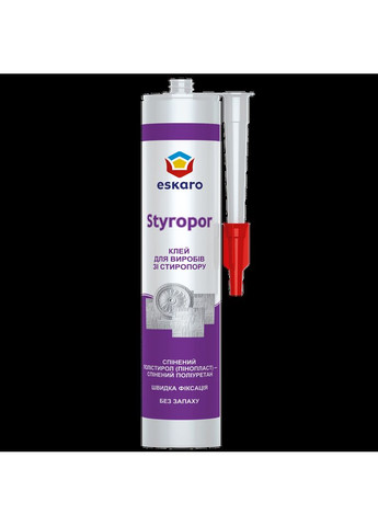 Властивості Styropor Strong — Універсальний клей для виробів зі стиропору Готовий до застосування Вологостійкий та морозостійкий Паропроникний та негорючий Високов'язкий, не стікає з вертикальної поверхні. Безусадковий завдяки високому наповненню. Має гарну початкову склеювальну здатність. Фіксація виробів відбувається до схоплювання клею, що дає змогу коригувати їх положення. Немає потреби додатково притискати виріб до поверхні й утримувати його для фіксації. Забезпечує високу міцність склеювання матеріалів (адгезію). Висохлий клей легко шліфувати і фарбувати. Без запаху. Призначення Styropor Strong — Для приклеювання на стелі і стіни виробів зі: «стиропору» — спіненого полістиролу (пінопласту) високої щільності, корки, спіненого поліуретану, спіненого поліуретану, на вбираючу або пофарбовану поверхню всередині й зовні приміщень. Для приклеювання декоративних елементів із полістиролу та поліуретану, мінеральної та базальтової вати на фасадах. Типи поверхонь, на якi можна клеїти Шпакльовані, пофарбовані, бетон, гіпсокартон, деревина, ДВП, ДСП і т.д. Стандарти якості Якість продукції й обслуговування гарантується системою управління якості у відповідності зі стандартом ISO 9001. Підготовка поверхні Поверхня повинна бути міцною, сухою, рівною, очищеною від пилу, крейдяної побілки, неміцних матеріалів, що відшаровуються. Забруднені й жирні поверхні промити 3–5% розчином соди, змити водою і висушити. Тріщини й нерівності зашпаклювати. Пористі поверхні заґрунтувати водно-дисперсійною ґрунтовкою ТМ Eskaro, ТМ Aura, TM Condor. Поверхні, пофарбовані алкідними та водно-дисперсійними фарбами, відшліфувати до шорсткості, видалити пил. Нанесення МОНТАЖ. Нанесіть клей на одну з поверхонь зиґзаґом або невеликими частими точками і відразу притисніть до основи. Якщо потрібно, додатково зафіксуйте поверхні до схоплювання клею. Повне висихання відбувається впродовж 48 годин. Максимальна міцність шва досягається після повного висихання. ТЕМПЕРАТУРА ЗАСТОСУВАННЯ. Від +10°С до +30°С. Температура приміщення, основи, елемента декору та клею повинна бути однаковою, відносна вологість не вище 85%. Робочі інструменти Пістолет для картриджа, шпатель. Очищення інструментів Одразу після використання промити водою. Засохлий клей очищується механічно. Склад Дисперсія співполімерів, спеціальні наповнювачі, функціональні добавки, вода. Колір білий Витрата 10–12 погонних метрів клею, якщо діаметр смуги 5–6 мм. Витрата клею залежить від нерівності поверхні та маси елементу декору. Чим більше маса елементу декору — тим більше витрата клею. Час висихання 48 годин за умов температури +20°С і відносної вологості повітря 65%. В разі зниження температури повітря час висихання відповідно збільшується. Фарбувати водно-дисперсійними фарбами елементи декору можна після висихання клею