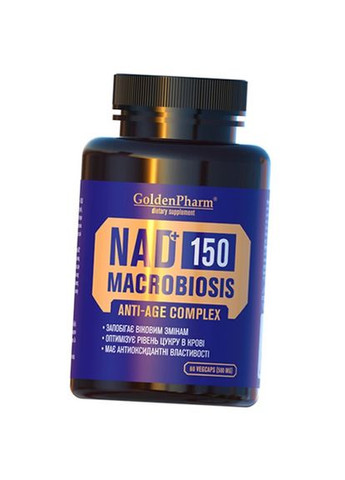 Харчова добавка для здоров'я та спорту NAD 150 від виробника Golden Pharm. NAD 150 Антивіковий – джерело NAD+ (похідна сполука вітаміну В3) та фітонутрієнтів. Добавка сприяє загальному зміцненню організму, нормалізації обміну речовин та кровообігу, оптимізації рівня цукру в крові. Потенціює дію нікотинаміду рибозиду, для запобігання віковим змінам, підтримує когнітивні функції мозку, посилює виробництво нейромедіаторів, хімічних речовин, що допомагають комунікації мозку, має антиоксидантні властивості. NAD+, або повна назва нікотинаміду аденін динуклеотид, є важливою молекулою, яка є у всіх живих клітинах, яка відіграє ключову роль у багатьох біологічних процесах. Метаболізм. NAD+ бере участь у перетворенні їжі на енергію, яку клітини можуть використовувати для виконання своїх функцій. Він переносить електрони в ланцюзі транспорту електронів, що є основним джерелом енергії для клітин. Регулювання генів. NAD+ бере участь у регуляції експресії генів, що впливає на те, які гени включаються та вимикаються в клітині. Відновлення ДНК. NAD+ необхідний деяких процесів репарації ДНК, які допомагають захищати геном від ушкоджень. Старіння. Рівень NAD+ в організмі знижується із віком. Підвищення рівня NAD+ може допомогти уповільнити процес старіння та пов'язані з ним захворювання. Оптимізація рівня цукру на крові. Інсулінорезистентність та переддіабетний стан є загальними симптомами старіння, тому діабет дуже поширений серед людей похилого віку. Деякі дослідження підтверджують вплив NAD+ на регулювання чутливості до інсуліну. Здоров'я нирок. NAD+ захищає функцію нирок і запобігає їх окисному стресу. Здоров'я серця. NAD+ може відновлювати еластичність судин та запобігати пошкодженню ендотелію (стінок артерії) – процес, що запускає всі заблоковані артерії. Крім того, NAD+ покращує кровообіг та відіграє певну роль у лікуванні застійної серцевої недостатності. Вплив на синдром хронічної втоми. NAD+ оптимізує процес перетворення їжі на енергію, посилює виробництво нейромедіаторів, хімічних речовин, що допомагають комунікації мозку. Вплив на фізичну активність. Прийом NAD+ підвищує аеробну витривалість та споживання кисню м'язами. Рівень NAD+ в організмі регулюється за допомогою ферментів, що перетворюють його з однієї форми на іншу. Нікотинамід рибозид хлорид – це форма вітаміну B3, яка перетворюється в організмі на кофермент NAD+. Нікотинамід Рибозид хлорид вважається більш біодоступною формою вітаміну B3, ніж нікотинова кислота або нікотинамід, що означає, що організм може його краще засвоювати. Він також може перетворюватися на NAD+ ефективніше, ніж інші форми вітаміну B3. Властивості активних компонентів NAD+: Кверцетин – флавоноїд. Має антиоксидантну та протизапальну дію, що може допомогти зменшити запалення, знищити ракові клітини, контролювати рівень цукру в крові та допомогти запобігти хворобам серця. Кверцетин регулює гени циркадного годинника і гени, пов'язані зі старінням. Екстракт зеленого чаю містить багато поліфенолів та інших корисних сполук. Поліфеноли – це тип антиоксидантів, які можуть допомогти захистити організм від ушкоджень, спричинених вільними радикалами. Екстракт зеленого чаю може покращити когнітивну функцію та пам'ять, допомогти знизити ризик серцево-судинних захворювань, знижуючи рівень холестерину та кров'яний тиск, допоможе зміцнити і